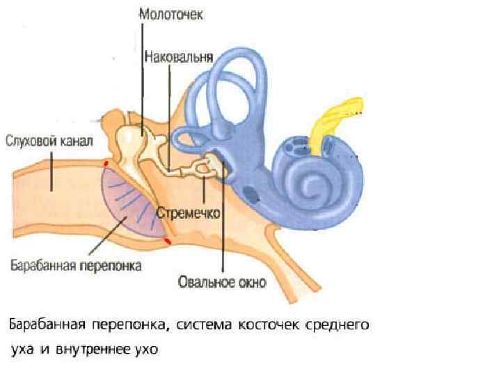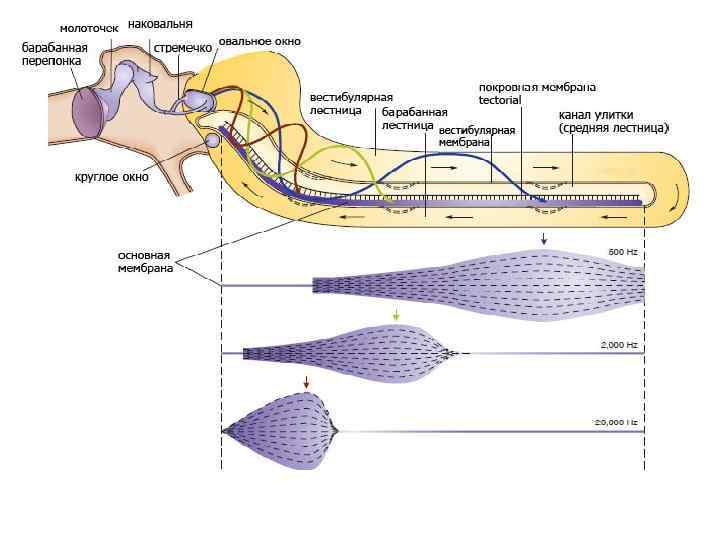 Среднее ухо. Проведение звука от барабанной перепонки к улитке. Барабанная перепонка и косточки, которые проводят звук от барабанной перепонки через среднее ухо к улитке (внутреннему уху). К барабанной перепонке прикреплена рукоятка молоточка. Молоточек связан с наковальней тонкими связками так, что при любом движении молоточка наковальня движется вместе с ним. С противоположного конца наковальня соединена с головкой стремечка, а основание стремечка прилежит к перепончатому лабиринту улитки в отверстии овального окна. Тонкий конец рукоятки молоточка прикрепляется к центру барабанной перепонки, прикрепления постоянно тянет мышца, напрягающая барабанную перепонку, и эту точку удерживая ее в напряженном состоянии. Это позволяет звуковым вибрациям в любой части барабанной перепонки передаваться к косточкам. Что невозможно при ненапряженной мембране. Косточки среднего уха подвешены таким образом, что молоточек и наковальня вместе действуют как единый рычаг, точка опоры которого находится примерно у края барабанной перепонки. Наковальня со стременем соединены, и каждый раз, когда барабанная перепонка движется внутрь, стремечко надавливает на овальное окно и жидкость в улитке с другой его стороны, и наоборот, когда молоточек движется наружу, стремечко “оттягивает” жидкость в обратном направлении.