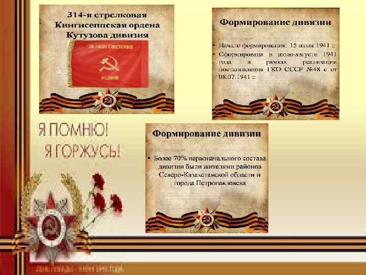 Более 70 процентов воинов были жителями города и районов Северо-Казахстанской области. 6 сентября 1941 года дивизия приняла первое боевое крещение по защите Ленинграда на огневом рубеже Заостровье. Лодейное Поле-Подпорожье. Дивизии была поставлена задача — стоять насмерть. И дивизия успешно справилась с поставленной задачей. В начале 1943 года 314 -я стрелковая дивизия участвовала в прорыве блокады Ленинграда, а далее путь ее лежал на Запад. С освободительными боями дивизия прошла Прибалтику, Польшу, Германию и завершила свой путь в Чехословакии. За боевые заслуги дивизии было присвоено звание Кингисеппской ордена Кутузова II степени.