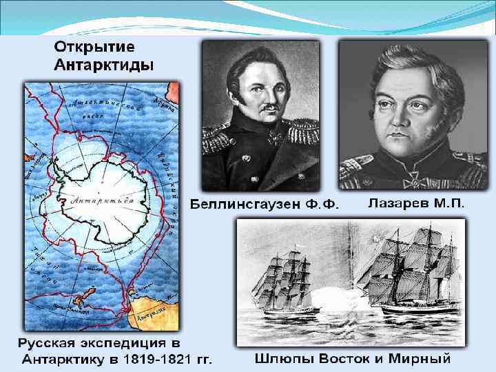 ДАТА ЭКСПЕДИЦИЯ ЗНАЧЕНИЕ 1803 -1806 первая кругосветная экспедиция Материалы изложены в «Атласе И. Крузенштерна и Ю. Лисянский Южных морей» , учреждено Российское географическое общество 1819 -1821 Антарктическая экспедиция Ф. Беллинсгаузена и М. Лазарева подошли к берегам Антарктиды, привезли ценные коллекции, данные наблюдений за водами Мирового океана. В течение жизни Правитель Российско. Американской компании на Аляске была создана сеть русских поселений и началось экономическое освоение кра 1848 -849, 1850 -1855 Экспедиции Г. И. Невельского 1822 -1825 Экспедиция Е. Путятина Доказал: Сахалин-остров, закрепление за Россией Приморского края. Открытие новых территорий