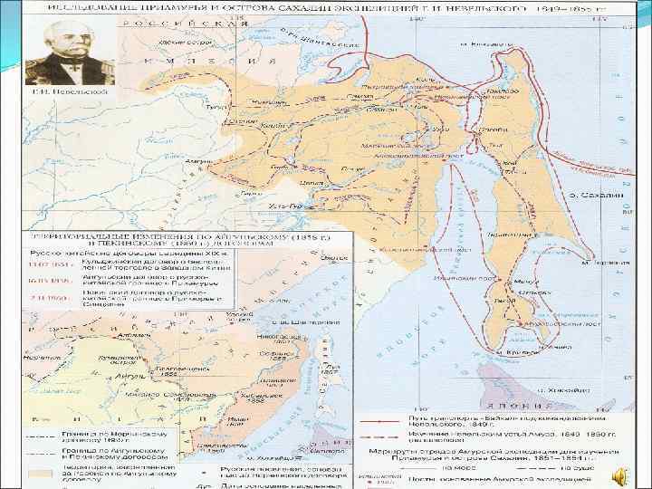 Геннадий Иванович Невельской (1813 -1876) В результате двух экспедиций было доказано, что Сахалин остров, а не полуостров, были открыты новые территории. Деятельность Г. И. Невельского способствовала закреплению за Россией Приморского края.