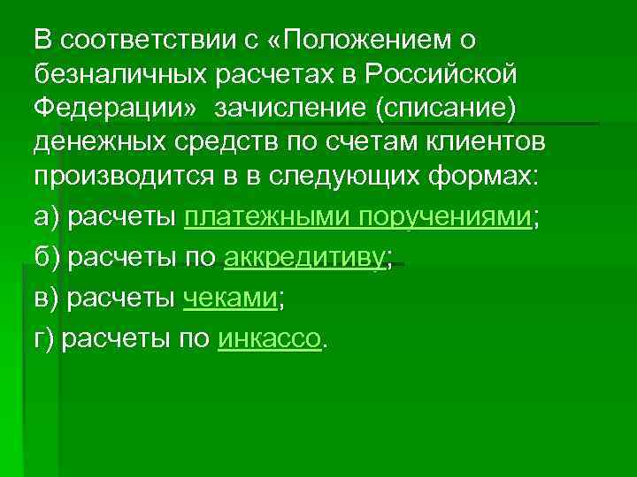 В соответствии с «Положением о безналичных расчетах в Российской Федерации» зачисление (списание) денежных средств по счетам клиентов производится в в следующих формах: а) расчеты платежными поручениями; б) расчеты по аккредитиву; в) расчеты чеками; г) расчеты по инкассо.