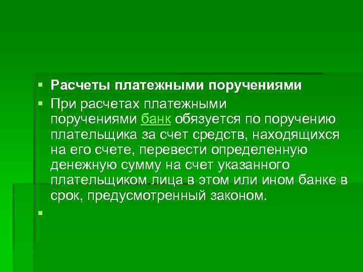 § Расчеты платежными поручениями § При расчетах платежными поручениями банк обязуется по поручению плательщика за счет средств, находящихся на его счете, перевести определенную денежную сумму на счет указанного плательщиком лица в этом или ином банке в срок, предусмотренный законом. §
