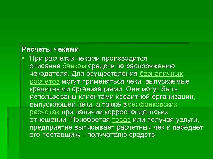 Расчеты чеками § При расчетах чеками производится списание банком средств по распоряжению чекодателя. Для осуществления безналичных расчетов могут применяться чеки, выпускаемые кредитными организациями. Они могут быть использованы клиентами кредитной организации, выпускающей чеки, а также вмежбанковских расчетах при наличии корреспондентских отношений. Приобретая товар или получая услуги, предприятие выписывает расчетный чек и передает его поставщику - получателю средств