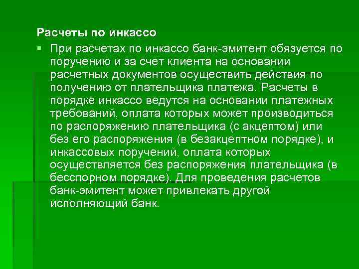 Расчеты по инкассо § При расчетах по инкассо банк-эмитент обязуется по поручению и за счет клиента на основании расчетных документов осуществить действия по получению от плательщика платежа. Расчеты в порядке инкассо ведутся на основании платежных требований, оплата которых может производиться по распоряжению плательщика (с акцептом) или без его распоряжения (в безакцептном порядке), и инкассовых поручений, оплата которых осуществляется без распоряжения плательщика (в бесспорном порядке). Для проведения расчетов банк-эмитент может привлекать другой исполняющий банк.