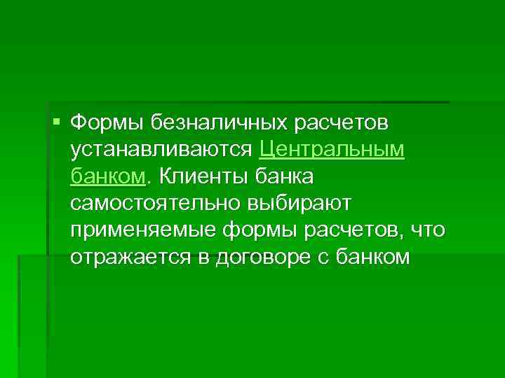 § Формы безналичных расчетов устанавливаются Центральным банком. Клиенты банка самостоятельно выбирают применяемые формы расчетов, что отражается в договоре с банком