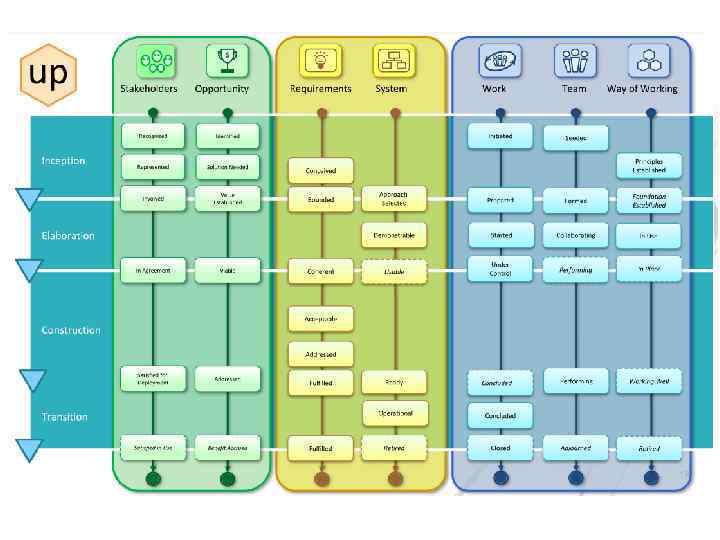 State Checklist Recognized q All the different groups of stakeholders that are, or will be, affected by the development and operation of the software system are identified. q There is agreement on the stakeholder groups to be represented. At a minimum, the stakeholders groups that fund, use, support, and maintain the system have been considered. q The responsibilities of the stakeholder representatives have been defined. Represented q q Involved q The stakeholder representatives assist the team in accordance with their responsibilities. q The stakeholder representatives provide feedback and take part in decision making in a timely manner. q The stakeholder representatives promptly communicate changes that are relevant for their stakeholder groups. In Agreement q The stakeholder representatives have agreed upon their minimal expectations for the next deployment of the new system. q The stakeholder representatives are happy with their involvement in the work. q The stakeholder representatives agree that their input is valued by the team and treated with respect. q The team members agree that their input is valued by the stakeholder representatives and treated with respect. q The stakeholder representatives agree with how their different priorities and perspectives are being balanced to provide a clear direction for the team. Satisfied for Deployment q The stakeholder representatives provide feedback on the system from their stakeholder group perspective. q The stakeholder representatives confirm that the system is ready for deployment. Satisfied in Use q Stakeholders are using the new system and providing feedback on their experiences. q The stakeholders confirm that the new system meets their expectations. The stakeholder representatives have agreed to take on their responsibilities. The stakeholder representatives are authorized to carry out their responsibilities. The collaboration approach among the stakeholder representatives has been agreed. The stakeholder representatives support and respect the team's way of working.
