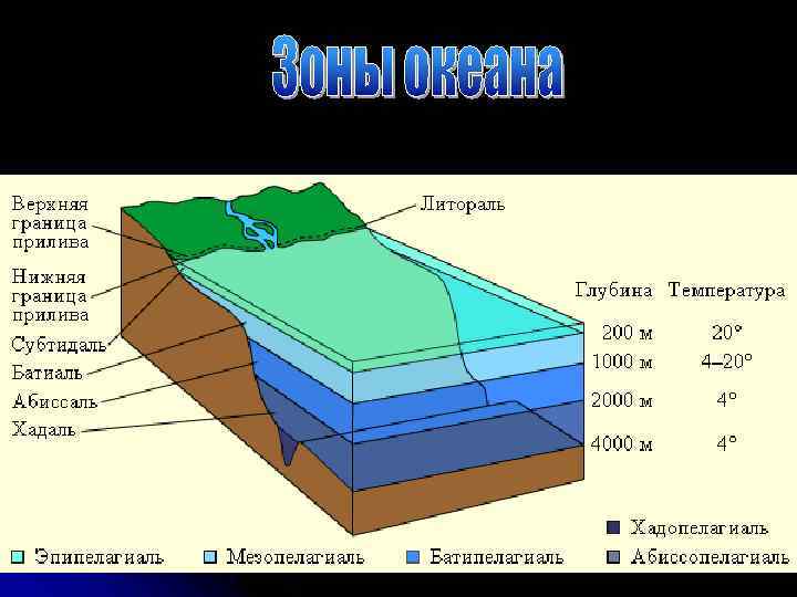 В морской воде всегда растворены различные газы. Большая часть из них проникает в воду из атмосферы. Это подтверждается химическим родством состава газов, образующих атмосферный воздух и растворенных в морской воде, что видно из следующих данных: Содержание в объемных %: атмосфера гидросфера N 2 – 79 64 O 2 – 21 36 По насыщенности растворенным кислородом выделяются три вертикальные зоны: 1. Верхняя зона, близкая к поверхности, имеет мощность от 100 до 300 м и характеризуется наиболее высоким содержанием растворенного кислорода(8 9 мг/л в высоких широтах и 4, 3 5 мг/л – в низких). Концентрация кислорода в верхней зоне определяется соотношением процессов фотосинтеза, абсорбции, идущих с выделением кислорода и поглощением его животнымии растительными организмами, и процессами окисления. 2. Средняя зона расположена на глубинах 200 400 м и характеризуется значительно более низким содержанием кислорода (0, 4 1, 0 мг/л). 3. Глубинная зона охватывает глубины 1400 600 м, содержание кислорода в среднем составляет 5 мг/л, источником его поступления являются глубинные арктические и антарктические течения.