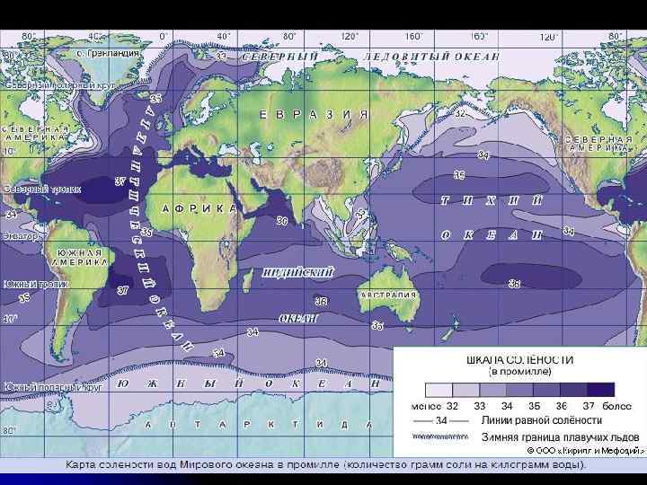 В воде океанов присутствуют почти все химические элементы, известные на Земле. Однако в количественном отношении в составе морской воды резко преобладают только четыре химических элемента: кислород, водород, хлор и натрий, на долю которых приходится 99, 5% по весу. Содержание растворенных в морской воде химических элементов и соединений, ее соленость определяются или в весовых процентах, или в промиллях (1‰). Средняя соленость морской (океанической) воды равна 35‰. Это значит, что в 1 л (1 кг) воды содержится 35 г солей. Средняя химическая характеристика морской воды Название солей Содержание солей в граммах на 1 л воды Хлориды: Хлористый натрий (Nа. Сl) в вес. % 27, 2 77, 8 3, 8 10, 9 1, 7 4, 7 Сернокислый кальций (Са. SО 4) 1, 2 3, 6 Сернокислый калий (К 2 SО 4) 0, 9 2, 5 Углекислый кальций (Са. СО 3) 0, 1 0, 3 Бромистый магний (Мg. Вr 2) 0, 1 0, 2 Хлористый магний (Мg. Сl 2) Сульфаты: Сернокислый магний (Мg. SО 4) Всего 35, 0 100, 0