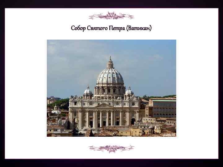 8. Ренессанс – (фр. «Возрождение» ) Архитекторы той эпохи стремились возродить зодчество «золотого века» античности. Искусство Ренессанса не просто заимствовало архитектурные формы античности, но применяло их в новых композициях. Характерными сооружениями эпохи Возрождения явл. дворцы-палаццо Флоренции, Венеции, всемирно известный Собор Святого Петра (Ватикан) и др.
