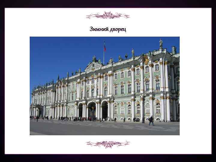 9. Барокко Один из главных архитектурных стилей в европейских странах (ХVI – середина ХVIII в. ) (итал. – причудливый. , странный). Во времена барокко на первом месте стояла пышность. Здания обязательно украшались причудливыми фасадами, лепкой, множеством скульптур. Основатель эпохи барокко – великий Микеланджело Буонарроти. Русское барокко – расцвет приходится на первую половину ХVIII в. (церковь в Филях, Москва) Очень любили этот стиль князья Нарышкины дворянский род (женитьба царя Алексея Михайловича на Наталье Нарышкиной). Именно поэтому московское барокко (к. ХVII – н. ХVIII в. в. ) принято наз. нарышкинским. Представителем барокко в России был зодчий В. В. Растрелли. Зимний дворец (1754 – 1962 г. г. ) Смольный монастырь в Петербурге Екатерининский дворец в царском селе Большой дворец в Петергофе и др.
