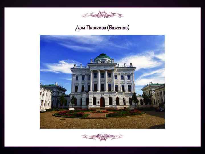 11. Классицизм (лат. образцовый), возник приблизительно с 70 годов ХVIII в. во Франции. Классицизм продолжал античные традиции. Архитектурные формы подчеркнуто правильные, композиции – обязательно симметричные. Строгий порядок, ясность и организованность – вот дух классицизма. Московский университет на Моховой Манеж Дом Пашкова (Баженов) Дом Союзов (ныне) – Колонный зал – дом Благородного собрания (Казаков).