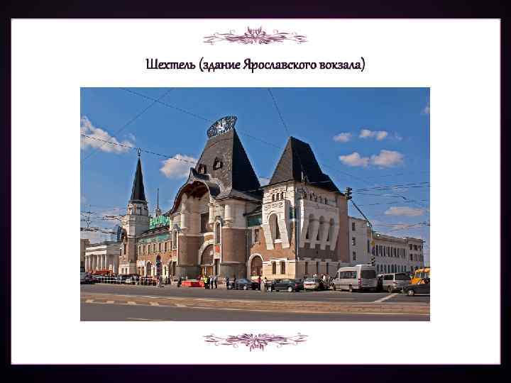 13. Модерн – (фр. – современный) (арт-нуво) Здания в стиле модерн, не похожи ни на какие классические образцы, они рождены ничем не скованной фантазией зодчего. Для модерна характерны плавные изгибы стен, криволинейные очертания окон и дверей, отсутствие симметрии, живописность цветовых решений. В стиле модерн строились в основном городские особняки и загородные виллы. Шехтель (здание Ярославского вокзала).