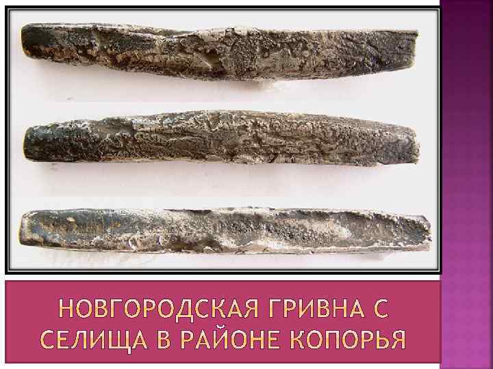 «Монетная гривна» — крупный «неразменный» слиток серебра. Имела хождение в так называемый «безмонетный период» Древней Руси (XII, XIII и частично XIV век), когда прекратилась чеканка древнерусских монет (златника, сребреника) и начали поступать в обращение зарубежные монеты «Киевская гривна» — гривна шестиугольной формы, имевшая хождение в Киевской Руси с XI века и имевшая вес около 163— 165 граммов «Новгородская гривна» — длинная серебряная палочка весом около 204 граммов. Имела наибольшее значение в денежном обращении. Изначально была распространена на северо-западе Руси, а с середины XIII века распространилась по всей территории Древней Руси «Черниговская гривна» — переходная форма между киевской и новгородской гривнами. По форме была близка к киевской, а по весу — к новгородской «Татарская гривна» — гривна ладьеобразной формы, имевшая хождение на территории Поволжья наряду с татарскими монетами XIV века Литовский (западнорусский) рубль - палочкообразные слитки серебра с одной или несколькими вмятинами на спинке размером 10 -17 см, весом 100— 105 г. В источниках называется гривна, изрой Литовский (западнорусский) трехгранный рубль - палочкообразные трёхгранные слитки серебра весом 170 -189 г.