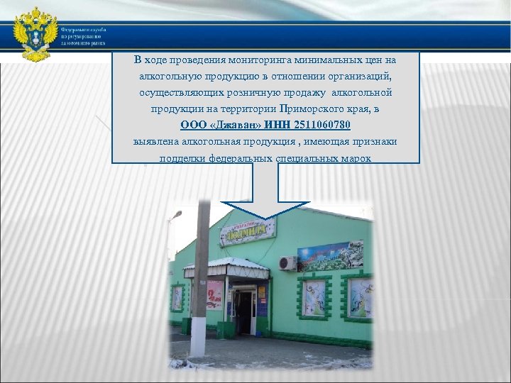 В ходе проведения мониторинга минимальных цен на алкогольную продукцию в отношении организаций, осуществляющих розничную продажу алкогольной продукции на территории Приморского края, в ООО «Джаван» ИНН 2511060780 выявлена алкогольная продукция , имеющая признаки подделки федеральных специальных марок