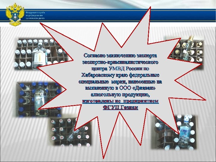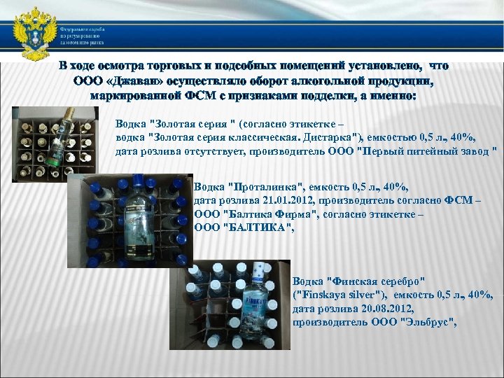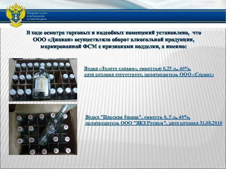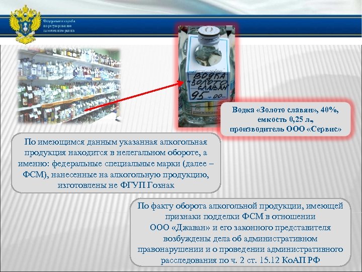 Водка «Золото славян» , 40%, емкость 0, 25 л. , производитель ООО «Сервис» По имеющимся данным указанная алкогольная продукция находится в нелегальном обороте, а именно: федеральные специальные марки (далее – ФСМ), нанесенные на алкогольную продукцию, изготовлены не ФГУП Гознак По факту оборота алкогольной продукции, имеющей признаки подделки ФСМ в отношении ООО «Джаван» и его законного представителя возбуждены дела об административном правонарушении и о проведении административного расследования по ч. 2 ст. 15. 12 Ко. АП РФ