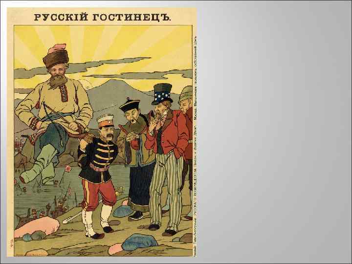 Восточная политика 1896 - подписание секретного Российскокитайского договора о союзе России и Китая против Японии. Договор предоставил России право на постройку железнодорожной магистрали через территорию Манчжурии. 1898 г. Восстание «Ихэтуань» ( «Отряды справедливости и мира» ). «Поддержим Цин, 1898 г. Аренда Ляодунского полуострова. Строительство ЮМЖД уничтожим иностранцев!» Восемь держав ввели в Китай свои войска. Восстание было жестоко подавлено.