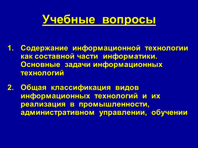 Учебные вопросы Содержание информационной технологии как составной части информатики. Основные задачи информационных технологий Общая классификация видов информационных технологий и их реализация в промышленности, административном управлении, обучении