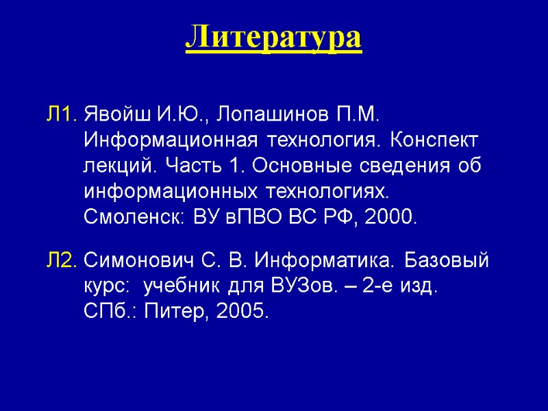 Л1. Явойш И.Ю., Лопашинов П.М. Информационная технология. Конспект лекций. Часть 1. Основные сведения об информационных технологиях. Смоленск: ВУ вПВО ВС РФ, 2000. Л2. Симонович С. В. Информатика. Базовый курс: учебник для ВУЗов. – 2-е изд. СПб.: Питер, 2005. Литература