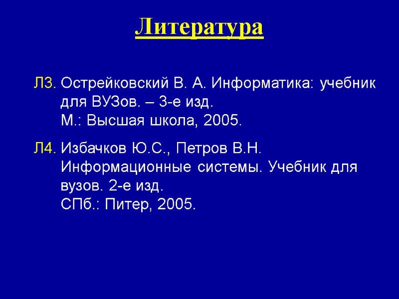 Л3. Острейковский В. А. Информатика: учебник для ВУЗов. – 3-е изд. М.: Высшая школа, 2005. Л4. Избачков Ю.С., Петров В.Н. Информационные системы. Учебник для вузов. 2-е изд. СПб.: Питер, 2005. Литература