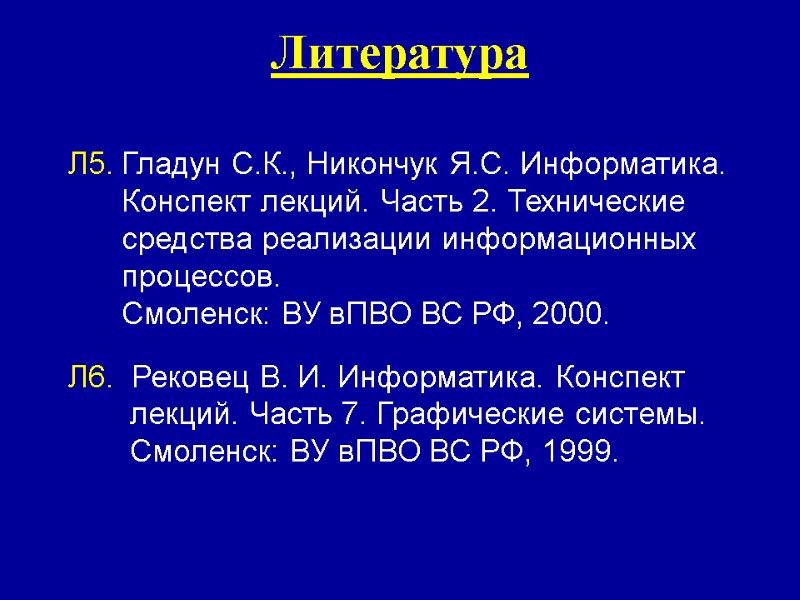 Л5. Гладун С.К., Никончук Я.С. Информатика. Конспект лекций. Часть 2. Технические средства реализации информационных процессов. Смоленск: ВУ вПВО ВС РФ, 2000. Л6. Рековец В. И. Информатика. Конспект лекций. Часть 7. Графические системы. Смоленск: ВУ вПВО ВС РФ, 1999. Литература