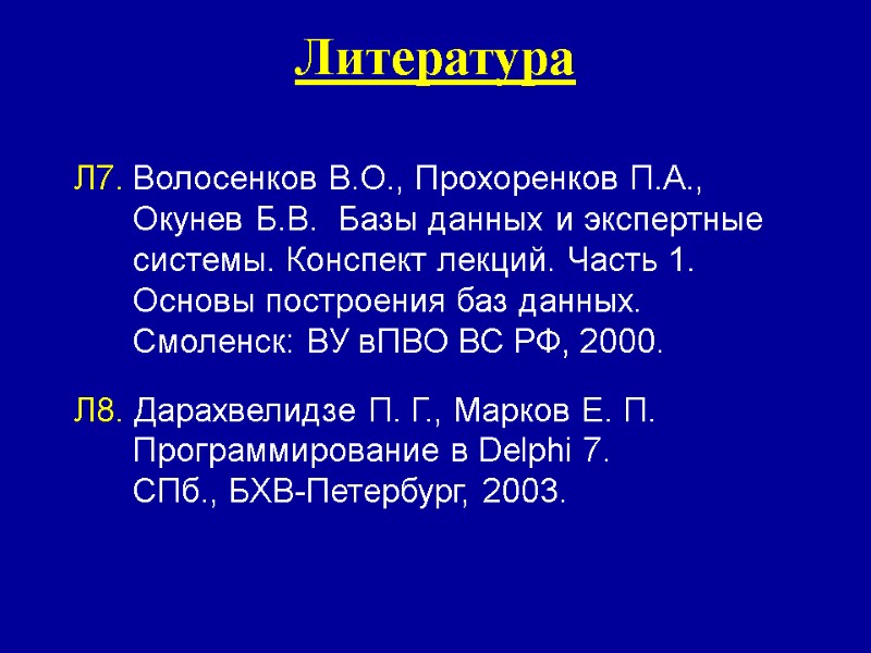 Л7. Волосенков В.О., Прохоренков П.А., Окунев Б.В. Базы данных и экспертные системы. Конспект лекций. Часть 1. Основы построения баз данных. Смоленск: ВУ вПВО ВС РФ, 2000. Л8. Дарахвелидзе П. Г., Марков Е. П. Программирование в Delphi 7. СПб., БХВ-Петербург, 2003. Литература