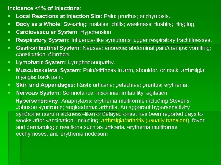 Incidence <1% of Injections: § Local Reactions at Injection Site: Pain; pruritus; ecchymosis. § Body as a Whole: Sweating; malaise; chills; weakness; flushing; tingling. § Cardiovascular System: Hypotension. § Respiratory System: Influenza-like symptoms; upper respiratory tract illnesses. § Gastrointestinal System: Nausea; anorexia; abdominal pain/cramps; vomiting; constipation; diarrhea. § Lymphatic System: Lymphadenopathy. § Musculoskeletal System: Pain/stiffness in arm, shoulder, or neck; arthralgia; myalgia; back pain. § Skin and Appendages: Rash; urticaria; petechiae; pruritus; erythema. § Nervous System: Somnolence; insomnia; irritability; agitation Hypersensitivity: Anaphylaxis; erythema multiforme including Stevens. Johnson syndrome; angioedema; arthritis. An apparent hypersensitivity syndrome (serum sickness–like) of delayed onset has been reported days to weeks after vaccination, including: arthralgia/arthritis (usually transient), fever, and dermatologic reactions such as urticaria, erythema multiforme, ecchymoses, and erythema nodosum