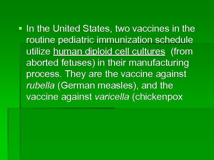 § In the United States, two vaccines in the routine pediatric immunization schedule utilize human diploid cell cultures (from aborted fetuses) in their manufacturing process. They are the vaccine against rubella (German measles), and the vaccine against varicella (chickenpox
