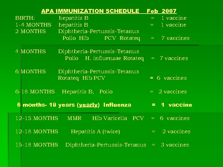 APA IMMUNIZATION SCHEDULE BIRTH: hepatitis B 1 -4 MONTHS hepatitis B 2 MONTHS Diphtheria-Pertussis-Tetanus Polio Hib PCV Rotateq 4 MONTHS 6 MONTHS Feb 2007 = 1 vaccine = 7 vaccines Diphtheria-Pertussis-Tetanus Polio H. influenzae Rotateq = 7 vaccines Diphtheria-Pertussis-Tetanus Rotateq Hib PCV = 6 vaccines 6 -18 MONTHS Hepatitis B, Polio 6 months- 18 years (yearly) Influenza 12 -15 MONTHS 12 -18 MONTHS 15 -18 MONTHS MMR Hib Varicella PCV Hepatitis A (twice) = 2 vaccines = 1 vaccine = 6 vaccines = 2 vaccines Diphtheria-Pertussis-Tetanus = 3 vaccines