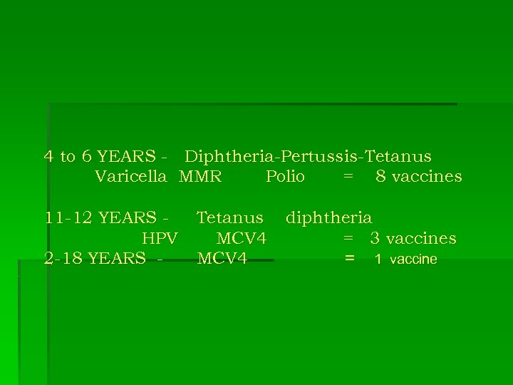 4 to 6 YEARS - Diphtheria-Pertussis-Tetanus Varicella MMR Polio = 8 vaccines 11 -12 YEARS Tetanus diphtheria HPV MCV 4 = 3 vaccines 2 -18 YEARS MCV 4 = 1 vaccine
