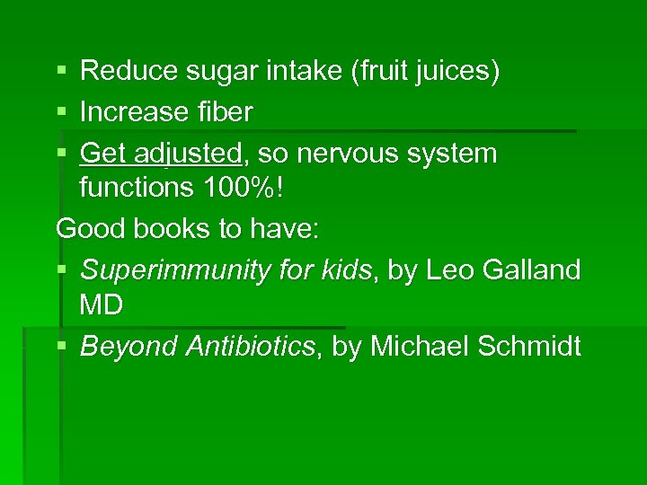 § § § Reduce sugar intake (fruit juices) Increase fiber Get adjusted, so nervous system functions 100%! Good books to have: § Superimmunity for kids, by Leo Galland MD § Beyond Antibiotics, by Michael Schmidt