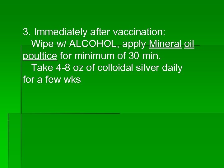 3. Immediately after vaccination: Wipe w/ ALCOHOL, apply Mineral oil poultice for minimum of 30 min. Take 4 -8 oz of colloidal silver daily for a few wks