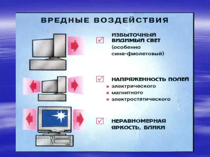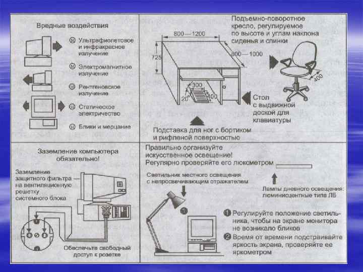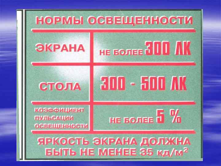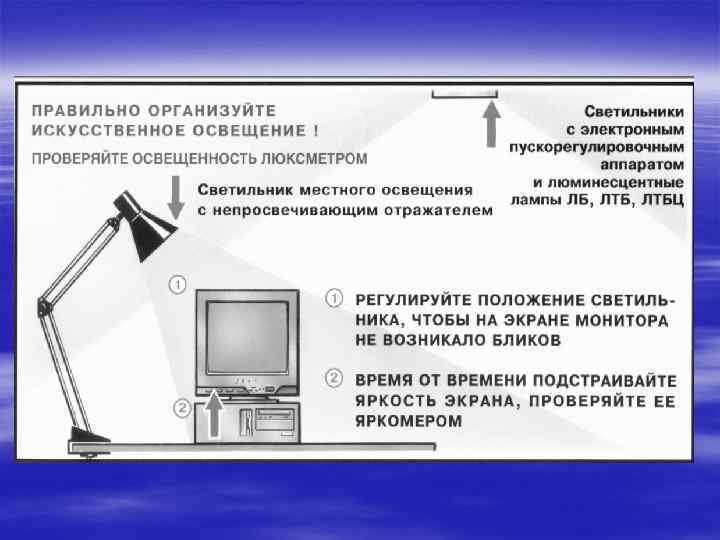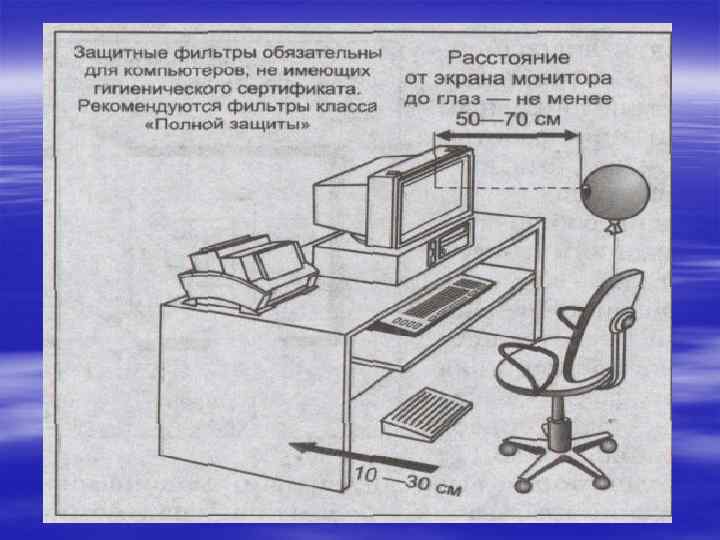 Комплекс упражнений для глаз Упражнения выполняются сидя или стоя, отвернувшись от экрана при рит мичном дыхании, с максимальной амплитудой движения глаз. 1. Закрыть глаза, сильно напрягая глазные мышцы, на счет 1— 4, затем раскрыть глаза, расслабив мышцы глаз, посмотреть вдаль на счет 1— 6. Повто рить 4— 5 раз.
