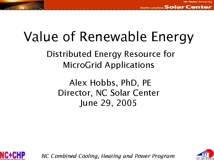 Value of Renewable Energy Distributed Energy Resource for Micro. Grid Applications Alex Hobbs, Ph. D, PE Director, NC Solar Center June 29, 2005 NC Combined Cooling, Heating and Power Program