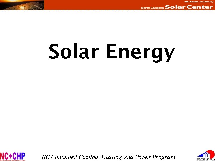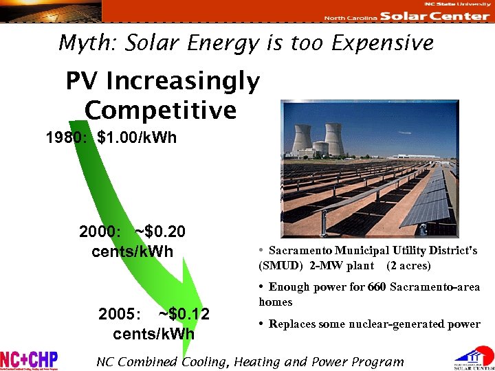 Myth: Solar Energy is too Expensive PV Increasingly Competitive 1980: $1. 00/k. Wh 2000: ~$0. 20 cents/k. Wh 2005: ~$0. 12 cents/k. Wh • Sacramento Municipal Utility District's (SMUD) 2 -MW plant (2 acres) • Enough power for 660 Sacramento-area homes • Replaces some nuclear-generated power NC Combined Cooling, Heating and Power Program