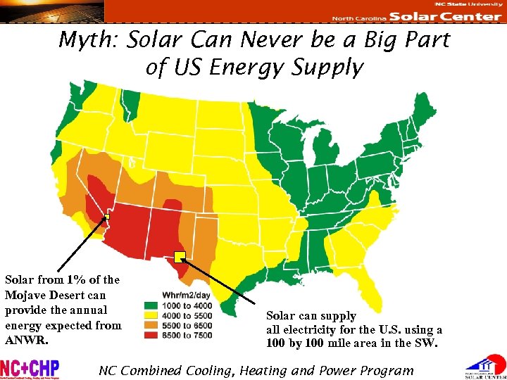 Myth: Solar Can Never be a Big Part of US Energy Supply Solar from 1% of the Mojave Desert can provide the annual energy expected from ANWR. Solar can supply all electricity for the U. S. using a 100 by 100 mile area in the SW. NC Combined Cooling, Heating and Power Program