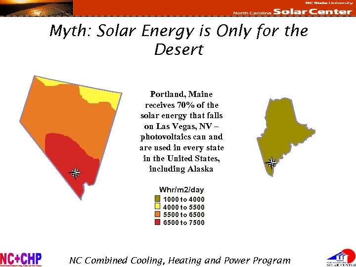 Myth: Solar Energy is Only for the Desert Portland, Maine receives 70% of the solar energy that falls on Las Vegas, NV – photovoltaics can and are used in every state in the United States, including Alaska Whr/m 2/day 1000 to 4000 to 5500 to 6500 to 7500 NC Combined Cooling, Heating and Power Program