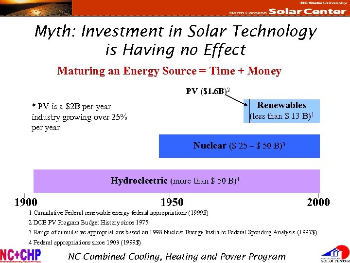 Myth: Investment in Solar Technology is Having no Effect Maturing an Energy Source = Time + Money PV ($1. 6 B)2 Renewables * PV is a $2 B per year industry growing over 25% per year (less than $ 13 B)1 Nuclear ($ 25 – $ 50 B)3 Hydroelectric (more than $ 50 B)4 1900 1950 2000 1 Cumulative Federal renewable energy federal appropriations (1999$) 2 DOE PV Program Budget History since 1975 3 Range of cumulative appropriations based on 1998 Nuclear Energy Institute Federal Spending Analysis (1997$) 4 Federal appropriations since 1903 (1999$) NC Combined Cooling, Heating and Power Program