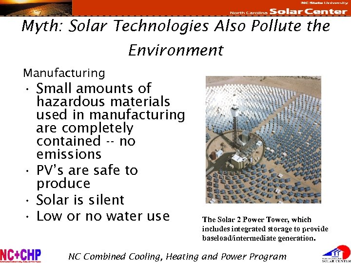 Myth: Solar Technologies Also Pollute the Environment Manufacturing • Small amounts of hazardous materials used in manufacturing are completely contained -- no emissions • PV’s are safe to produce • Solar is silent • Low or no water use The Solar 2 Power Tower, which includes integrated storage to provide baseload/intermediate generation. NC Combined Cooling, Heating and Power Program