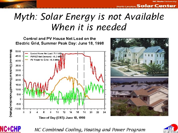 Myth: Solar Energy is not Available When it is needed Control and PV House Net Load on the Electric Grid, Summer Peak Day: June 18, 1998 Measured Electrical Demand/Production (Watts) 5000 Control Home Net Load: 71. 1 k. Wh 4500 PVRES Net Demand: 15. 2 k. Wh PV Power to Grid: 15. 6 k. Wh 4000 3500 3000 2500 2000 1500 1000 500 0 -500 -1000 0 2 4 6 8 10 12 14 16 18 20 22 24 Time of Day (EST): June 18, 1998 NC Combined Cooling, Heating and Power Program