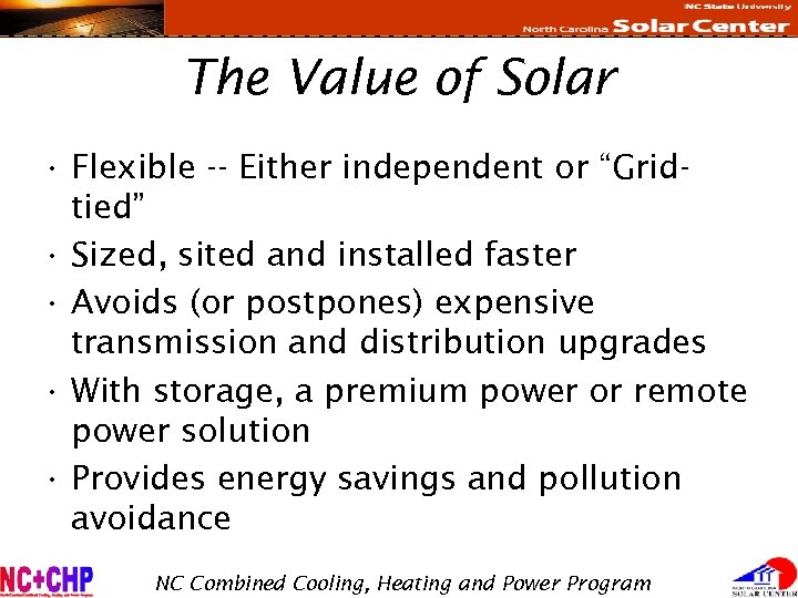 The Value of Solar • Flexible -- Either independent or “Gridtied” • Sized, sited and installed faster • Avoids (or postpones) expensive transmission and distribution upgrades • With storage, a premium power or remote power solution • Provides energy savings and pollution avoidance NC Combined Cooling, Heating and Power Program