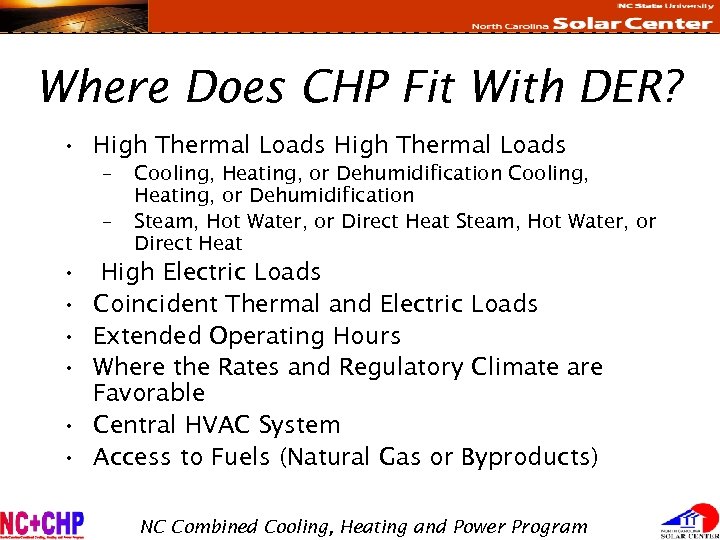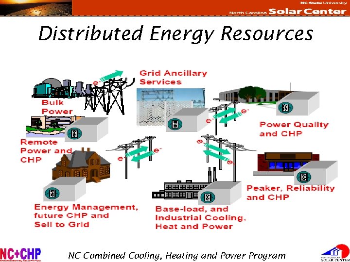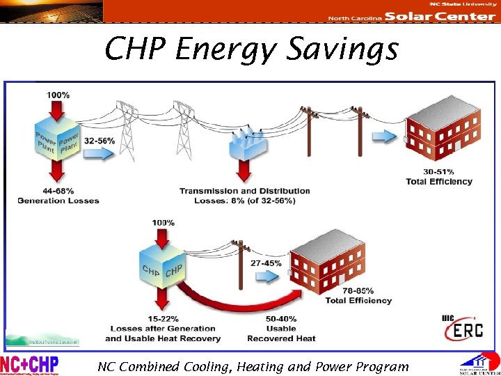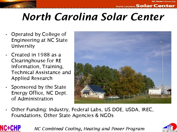 North Carolina Solar Center • Operated by College of Engineering at NC State University • Created in 1988 as a Clearinghouse for RE Information, Training, Technical Assistance and Applied Research • Sponsored by the State Energy Office, NC Dept. of Administration • Other Funding: Industry, Federal Labs, US DOE, USDA, IREC, Foundations, Other State Agencies & NGOs NC Combined Cooling, Heating and Power Program