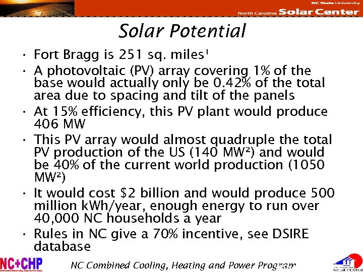 Solar Potential • Fort Bragg is 251 sq. miles¹ • A photovoltaic (PV) array covering 1% of the base would actually only be 0. 42% of the total area due to spacing and tilt of the panels • At 15% efficiency, this PV plant would produce 406 MW • This PV array would almost quadruple the total PV production of the US (140 MW²) and would be 40% of the current world production (1050 MW²) • It would cost $2 billion and would produce 500 million k. Wh/year, enough energy to run over 40, 000 NC households a year • Rules in NC give a 70% incentive, see DSIRE database NC Combined Cooling, Heating and Power Program www. ncsc. ncsu. edu