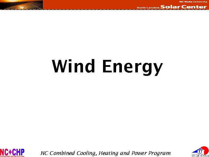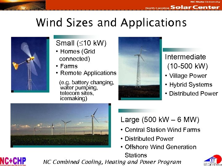 Wind Sizes and Applications Small ( 10 k. W) • Homes (Grid connected) • Farms • Remote Applications (e. g. battery changing, water pumping, telecom sites, icemaking) Intermediate (10 -500 k. W) • Village Power • Hybrid Systems • Distributed Power Large (500 k. W – 6 MW) • Central Station Wind Farms • Distributed Power • Offshore Wind Generation Stations NC Combined Cooling, Heating and Power Program