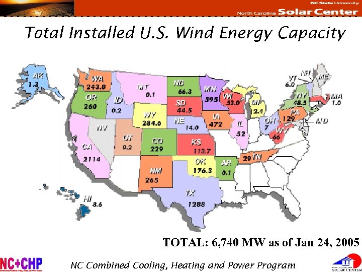 Total Installed U. S. Wind Energy Capacity TOTAL: 6, 740 MW as of Jan 24, 2005 NC Combined Cooling, Heating and Power Program