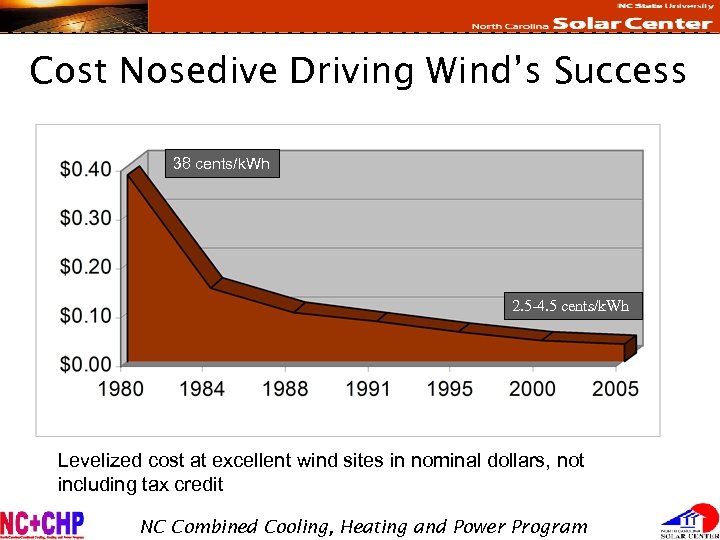Cost Nosedive Driving Wind’s Success 38 cents/k. Wh 2. 5 -4. 5 cents/k. Wh Levelized cost at excellent wind sites in nominal dollars, not including tax credit NC Combined Cooling, Heating and Power Program