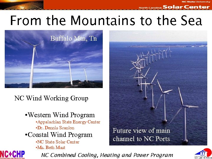 From the Mountains to the Sea Buffalo Mtn, Tn NC Wind Working Group • Western Wind Program • Appalachian State Energy Center • Dr. Dennis Scanlon • Coastal Wind Program • NC State Solar Center • Ms. Beth Mast Future view of main channel to NC Ports NC Combined Cooling, Heating and Power Program