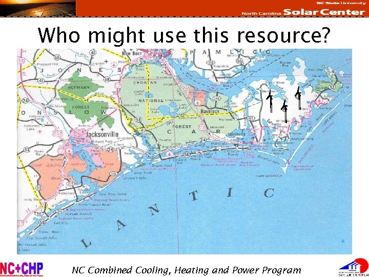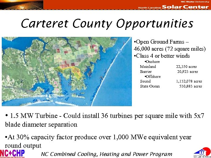Carteret County Opportunities • Open Ground Farms – 46, 000 acres (72 square miles) • Class 4 or better winds • Onshore Mainland Barrier • Offshore Sound State Ocean 22, 350 acres 20, 923 acres 1, 132, 078 acres 530, 883 acres • 1. 5 MW Turbine - Could install 36 turbines per square mile with 5 x 7 blade diameter separation • At 30% capacity factor produce over 1, 000 MWe equivalent year round output NC Combined Cooling, Heating and Power Program