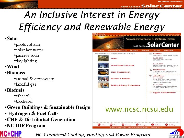An Inclusive Interest in Energy Efficiency and Renewable Energy • Solar • photovoltaics • solar hot water • passive solar • daylighting • Wind • Biomass • animal & crop waste • landfill gas • Biofuels • ethanol • biodiesel • Green Buildings & Sustainable Design • Hydrogen & Fuel Cells • CHP & Distributed Generation • NC IOF Program www. ncsc. ncsu. edu NC Combined Cooling, Heating and Power Program