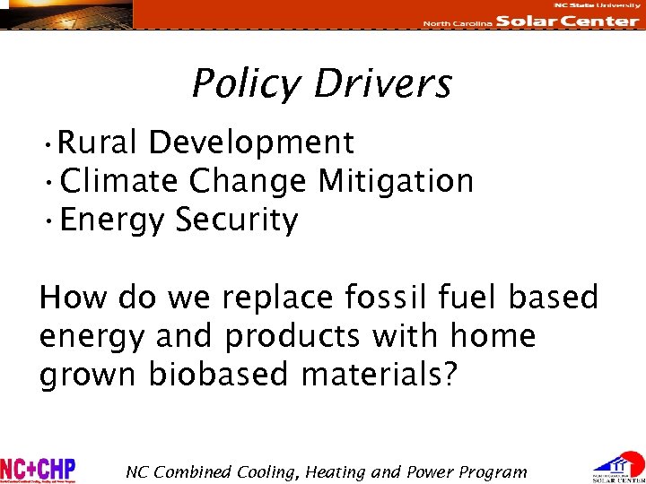 Policy Drivers • Rural Development • Climate Change Mitigation • Energy Security How do we replace fossil fuel based energy and products with home grown biobased materials? NC Combined Cooling, Heating and Power Program