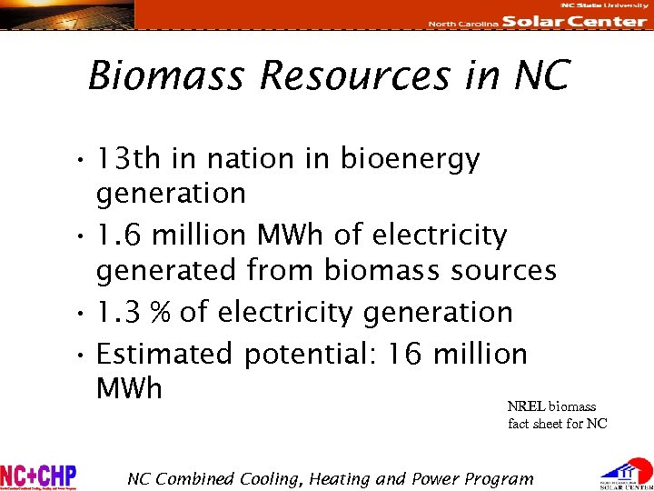 Biomass Resources in NC • 13 th in nation in bioenergy generation • 1. 6 million MWh of electricity generated from biomass sources • 1. 3 % of electricity generation • Estimated potential: 16 million MWh NREL biomass fact sheet for NC NC Combined Cooling, Heating and Power Program